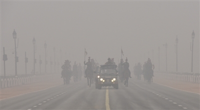 2016年1月7日,印度新德里,印度士兵在霧霾中進(jìn)行共和日閱兵彩排。印度媒體報(bào)道稱,機(jī)動(dòng)車排放是新德里空氣污染的重要原因。自今年1月1日起,新德里實(shí)行單雙號限行,交通擁堵情況得到明顯改善。