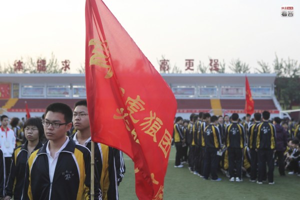 這樣的誓師大會(huì)每年都會(huì)舉行,而類似于誓師的各種勵(lì)志行動(dòng)在這里都相當(dāng)常見(jiàn)。圖為2012年5月1日,衡水二中操場(chǎng)上,一名學(xué)生舉著寫(xiě)有“虎狼團(tuán)”字樣的旗幟參加跑操。