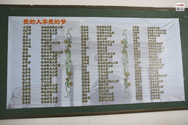 每當(dāng)空閑的時(shí)候,她便望向路對(duì)面校門(mén)口的展板上那張考上清華、北大學(xué)生與校長(zhǎng)的大合影。她希望明年在這里也能看到女兒的身影。