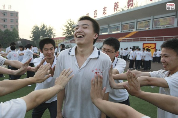 在這種壓力之下,學(xué)校也開(kāi)始想方設(shè)法為學(xué)生們?cè)黾有判?,有時(shí)候也會(huì)倡導(dǎo)“快樂(lè)高考”。圖為2012年5月30日,老師們帶領(lǐng)學(xué)生參加拓展訓(xùn)練以疏解壓力。