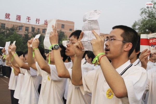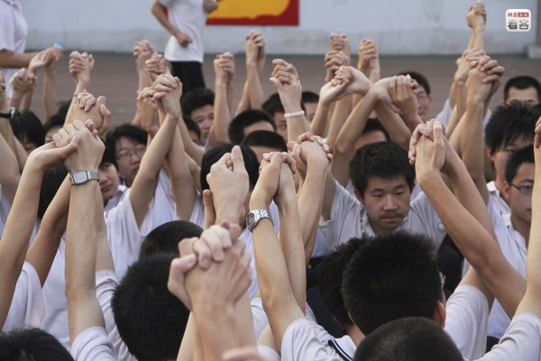 高考進(jìn)行前,學(xué)校還會(huì)帶領(lǐng)學(xué)生進(jìn)行最后一輪鼓勁,老師們穿著紅色T恤,背后寫(xiě)著“和你在一起”,學(xué)生們則集體穿著白色T恤,在老師的帶領(lǐng)下喊口號(hào)。圖為2011年6月8日,學(xué)生們即將參加高考。