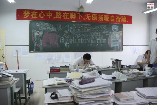 衡水市位于河北省東南部,這里以教育發(fā)達(dá)著稱,曾有“北衡水、南黃岡”的說(shuō)法。這里的重點(diǎn)中學(xué)衡水中學(xué)也創(chuàng)造了“衡水模式”從而聞名全國(guó)。但近年來(lái)衡水二中后來(lái)居上,無(wú)論從升學(xué)率還是宣傳實(shí)力,都有大幅度提升。圖為2009年6月2日,衡水二中的教室內(nèi),黑板上寫(xiě)著“拼盡最后一滴血,奮戰(zhàn)到底我堅(jiān)持”。