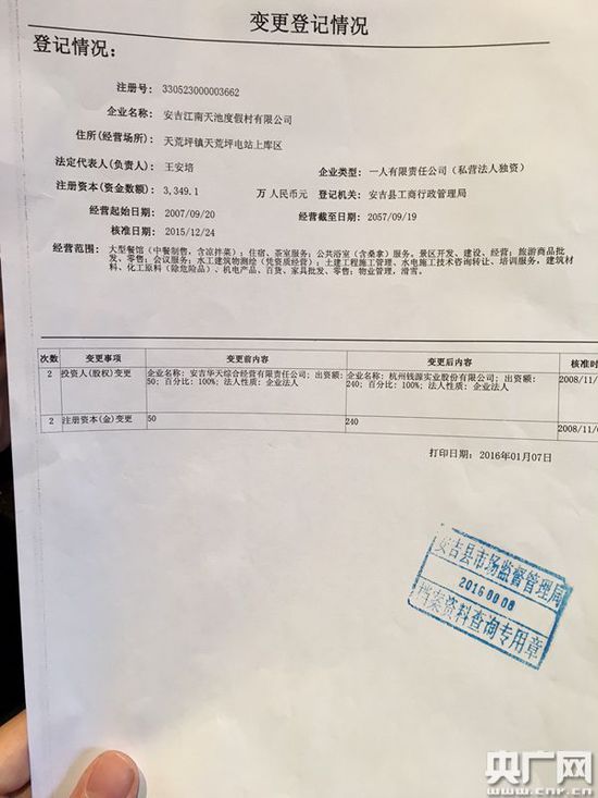 對(duì)此,王安培在接受記者采訪時(shí)稱,自己在2009年退休前,的確是電站工會(huì)主席,但江南天池公司和電站沒有關(guān)系:“我退休之前是電站的工會(huì)主席,09年退休,之前是不能搞三產(chǎn)的,這個(gè)我們是有規(guī)定的。10年推我當(dāng)董事長(zhǎng),變更法人成我的。錢源是我們退休的老同志,大家出點(diǎn)錢,在杭州注冊(cè)了一家錢源公司,拿了一點(diǎn)錢在安吉搞了一個(gè)江南天池度假村,和原來的三產(chǎn)沒有延續(xù)?!?/p>