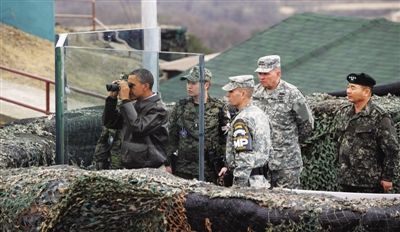 美國(guó)媒體分析稱,在美朝因?yàn)槌綔?zhǔn)備發(fā)射衛(wèi)星問題關(guān)系緊張之際,奧巴馬造訪三八線,“毫無疑問是為向朝鮮示威”。