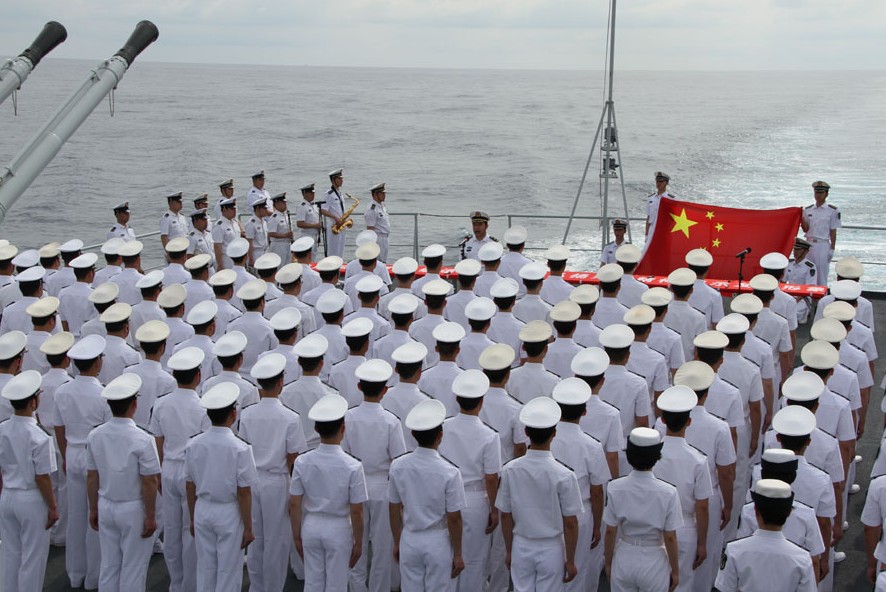 蔚藍(lán)的天空、湛藍(lán)的大海,當(dāng)金色的陽光鋪滿艦體,軍樂隊(duì)奏響雄壯的中華人民共和國國歌,在后甲板整齊列隊(duì)的“鄭和”艦官兵代表舉起右手,面向國旗莊嚴(yán)宣誓,表達(dá)他們對人民海軍的忠誠和熱愛。