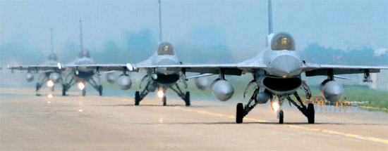 圖為韓國空軍KF-16戰(zhàn)斗機降落在第一戰(zhàn)斗飛行團跑道上,正前往停機場。