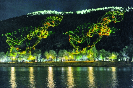 激光照射龍門(mén)山,迷離變幻現(xiàn)代感。