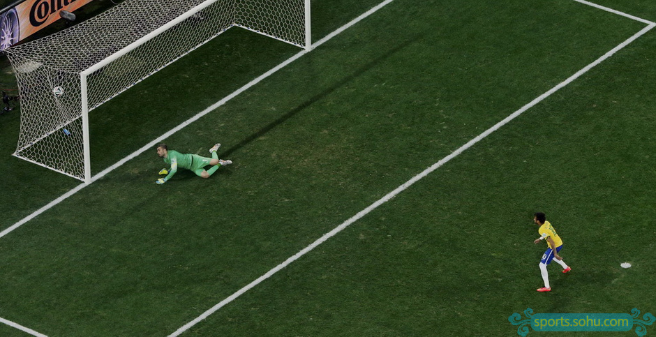 北京時間6月13日凌晨4時,2014年巴西世界杯揭幕戰(zhàn)在圣保羅競技場(科林蒂安競技場、伊塔蓋拉球場)展開,東道主巴西暫時2-1反超東歐勁旅克羅地亞。第69分鐘,奧斯卡右路低傳,弗雷德禁區(qū)內得球,洛夫倫在身后有一個并不明顯的拉扯動作,巴西前鋒應聲倒地,主裁判西村雄一順勢判罰點球,還向洛夫倫出示一張黃牌??肆_地亞球員不干了,立即圍住主裁判理論,但已經無法改變結果。內馬爾主罰的點球罰下球迷右側,普萊蒂科薩撲到皮球但仍無法阻止皮球入網,2-1,巴西逆轉比分,內馬爾梅開二度。圖為破門瞬間