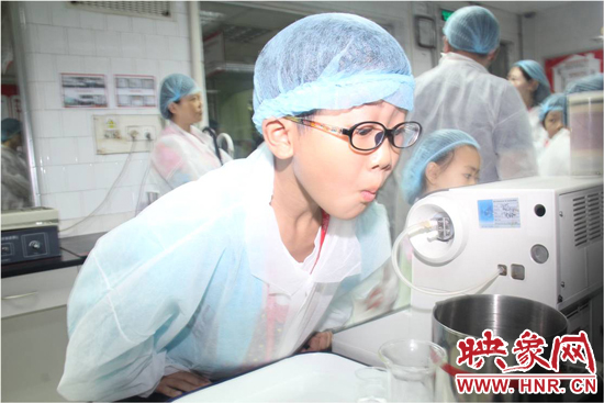 穿上白色的參觀服、戴上一次性帽子,受邀家庭進(jìn)入了檢測區(qū),參觀了質(zhì)量控制的檢測工作流程。正在工作的品控員,現(xiàn)場邀請了一名小朋友進(jìn)行了其中一項檢測--白利度檢測。“簡單來講,就是利用密度儀,測試一瓶飲料的糖度和含氣量兩個指標(biāo)?!逼房貑T張青介紹道。