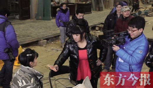 雖然“美食街”上人跡罕至,然而當(dāng)節(jié)目組來到《大河兒女》的攝影棚時(shí),卻發(fā)現(xiàn)這里人頭攢動(dòng)。劇中的明星大腕、劇組工作人員、媒體記者將這里圍得水泄不通。而香香最關(guān)心的則是:來河南拍戲的明星們?nèi)绾慰创幽厦朗衬兀繛槁牭剿麄兊男穆?,香香客串起了娛樂記者?/p>