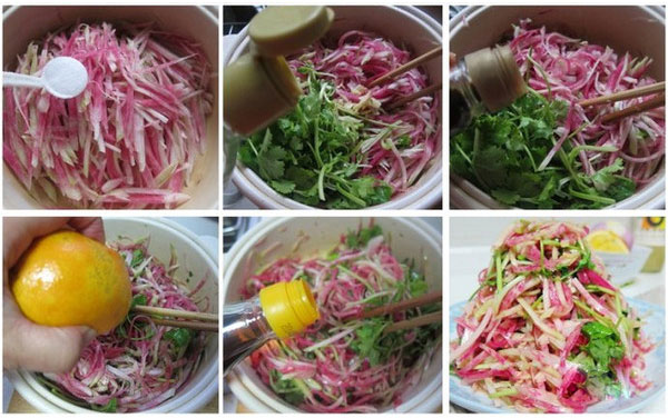 食材:水果蘿卜一個,香菜幾棵,橙子半個(取汁),白醋、調(diào)汁魚露、麻油、鹽等少許。