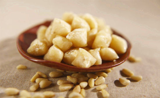 做法:先將白砂糖放入鍋中加少許水,用文火煎熬至粘稠,再加入松子仁,調(diào)勻。然后繼續(xù)煎熬,直至用鏟子挑起成絲狀,不粘手時(shí),?;?,將糖倒在涂有食用油的盤(pán)中,待稍涼,將糖切成小塊,即可食用。