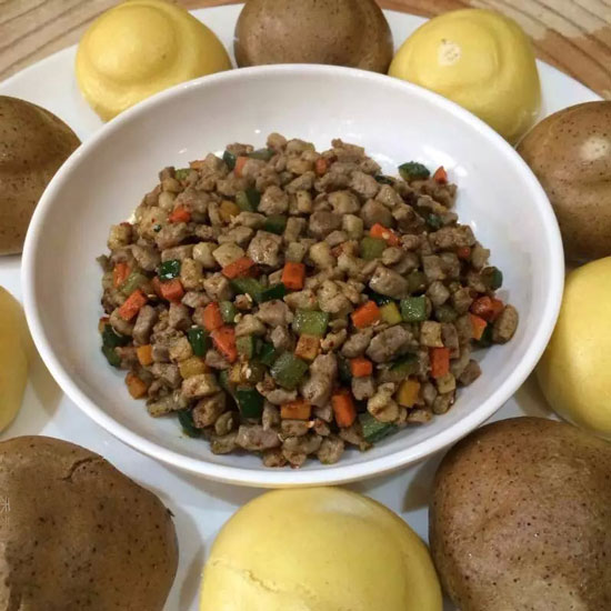 4、鍋中留少許油,蒜蓉炒香,然后倒入滑過油的肉丁,加入辣椒孜然粉,鹽,味精,雞粉,翻炒均勻就可以出鍋了,再搭配上精致的窩窩頭,相信您一定會愛不釋口!