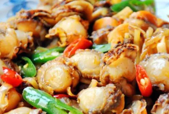 1.新鮮扇貝肉洗凈,用清水泡半小時。蒜、蔥改刀切絲、辣椒切小段。