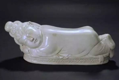 這件宋定窯“美人枕”,長43厘米,寬15.5厘米,質(zhì)地細膩,釉色白潤如玉,工藝精巧。此枕塑造了一個豐滿美人的“迷人睡姿”—其雙手枕于頭下,兩腳疊壓稍稍抬起,衣紋線條流暢,盡顯雍容華貴,透露出唐人遺風(fēng)。