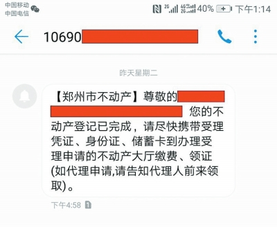 大河報記者了解到,鄭州市不動產(chǎn)登記中心目前正式推出了業(yè)務(wù)辦結(jié)的短信提醒服務(wù)。當不動產(chǎn)登記部門在辦結(jié)申請人的相關(guān)申請后,便會給申請人(代理人)發(fā)去短信,提醒其及時前往不動產(chǎn)登記部門領(lǐng)取不動產(chǎn)登記證書、證明?!皬臉I(yè)務(wù)辦結(jié)到領(lǐng)證還有一些內(nèi)部流轉(zhuǎn)程序,一般情況下,我們都是在繕證完成后24小時發(fā)送短信。”相關(guān)負責(zé)人介紹說。