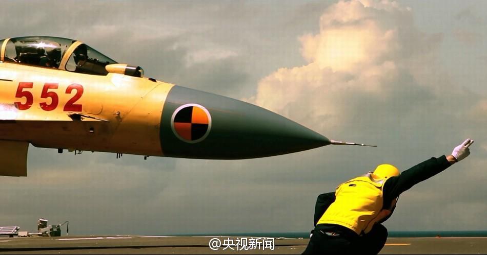 昨天,央視新聞首先在節(jié)目中播出這一視頻。視頻配以恢宏的音樂,記錄了殲15艦載機在遼寧艦上起飛、著艦的畫面。視頻以飛行員的日?;居?xùn)練作為開頭,描述了飛行員做起飛前的準(zhǔn)備工作、飛行中駕駛飛機及著陸的狀態(tài)。值得注意的是,視頻中,還有近10秒時間展示了殲15在空中進(jìn)行特技飛行動作的畫面,飛行員駕駛飛機進(jìn)行翻轉(zhuǎn),畫面中天空與地面的位置調(diào)轉(zhuǎn)。