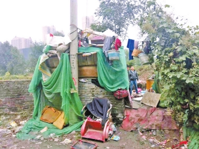 他們從花園路劉莊到鄭上路,走了近2個小時(shí)。走到鄭上路須水河西岸時(shí),發(fā)現(xiàn)在一塊荒蕪的墳地中,有一窩棚,隱約看到有身影在走動。近前看到,一位瘦黑的老人站在雨里,正在一簡陋土灶上煮面條。老人身上的衣服已淋濕,陪老人的是一條流浪狗,狗是老人撿的。窩棚很小,僅能容下一人,蜷縮著才能躺下。由于窩棚漏雨,鋪蓋內(nèi)也是濕的。