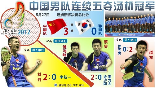 北京,2012年5月27日 圖表:中國男隊(duì)連續(xù)五奪湯杯冠軍 新華社記者 盧哲 編制