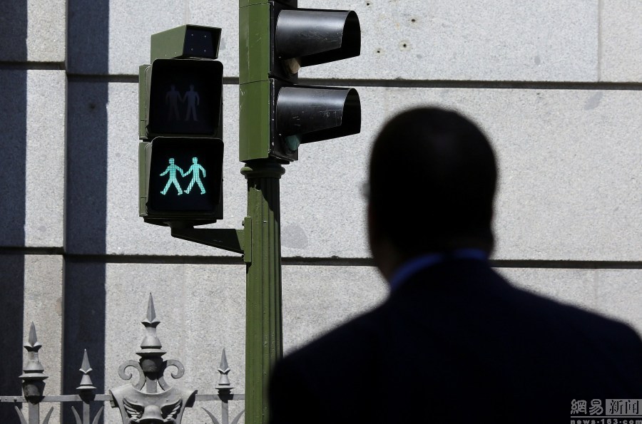 當地時間2017年6月6日,西班牙馬德里,當地同性戀交通燈顯示同性小人手牽手過馬路。