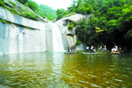 龍?zhí)稖仙角逅?,石奇崖險,頗具登臨之趣。整個峽谷兩側(cè)是花崗巖山體,一色的蒼青如黛,更顯巨石秀姿。大龍?zhí)陡浇囊粔K巨石酷似鱷魚頭,正伸入水中飲水,游人稱之為“鱷魚戲水”;“四連瀑”附近有塊巨石更是神奇,從對面山頭看,猶如豬八戒的頭,像是伸出水面偷看龍女洗澡,人們稱之為“八戒窺浴”;從后面看又酷似船頭,因此又叫“船石”;黑龍?zhí)杜赃呌腥龡l極像鯊魚的巨石,魚頭伸向潭水,美其名曰“三鯊鬧龍?zhí)丁?。此外,還有“絕壁掛雪”、“神龜過江”、“鯉魚跳龍門”等。奇石遍布,形態(tài)各異,惟妙惟肖,渾然天成。