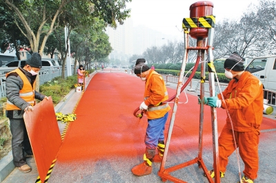 “機動車道6米寬,鋪設(shè)‘綠道’的自行車道也為6米寬??磻T了灰黑色的路面,在看到色彩明銳的‘綠道’后肯定覺得眼前一亮?!G道’只是叫法,并不是說道路外觀一定是綠色的,在景觀設(shè)計中,‘綠道’往往有著更深更廣的內(nèi)涵?!惫こ特?fù)責(zé)人呂先生告訴記者,彩色瀝青厚度僅為1到2毫米,壽命在5年以上,具有警示、防滑、降噪、美觀等特點?!拔覈G道’通常以警示色紅色為主打,主要作用是打造人車分離模式,供騎車者和步行者休閑使用?!?/p>